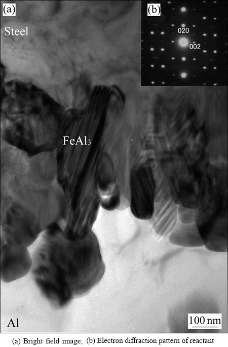 图4(a)所示为处于焊点边缘的不连续界面反应物的TEM明场像。由图4(a)可知,界面反应物是由100~200 nm微细晶粒构成。图4(b)显示了该区域反应物的衍射斑点图像,通过解析得知这些反应物为金属间化合物FeAl3。也就是说,生成于焊点外缘处的不连续反应物层主要由微细的FeAl3构成。