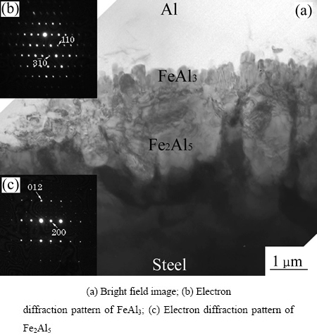 图5(a)所示为焊点中心附近的界面区TEM明场像。由图5(a)可知,界面反应物层有两层构成。靠近铝合金侧是由大小约为0.2 μm的细小晶粒组成的反应物层,其厚度较薄。而靠近低碳钢侧则是由舌状的粗大晶粒构成的反应物层,其厚度也较厚。界面反应层的形貌也与图2所示的界面区SEM像较吻合。通过对图5(b)和(c)所示为反应物电子衍射斑点进行解析,可判断靠近铝合金侧微细的反应物为金属间化合物FeAl3,靠近低碳钢侧较为粗大的反应物是金属间化合物Fe2Al5。