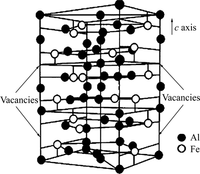 根据Fe-Al二元相图[14]可知,Fe-Al间金属间化合物有多种。但是,本研究中在界面主要检测出Fe2Al5和FeAl3两种平衡相。这是因为在Fe-Al系化合物中,FeAl3的生成自由能最低而最容易生成[7, 14-16]。而Fe2Al5的生成自由能比FeAl3的较高,却生成的Fe2Al5晶粒较大,其层也较厚。这主要由两种金属间化合物在生长动力学方面的不同所致。如图6所示,在Fe2Al5的[001]方向(沿c轴方向)存在大量Al 原子空位[17],存在浓度差,致使Al 原子沿该方向扩散速度较大、其生长速度较大。