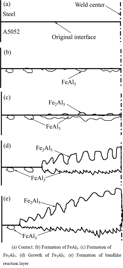 在焊点中心部位,温度较高、高温停留时间也长,生成的Fe2Al5反应层较厚。这也减缓了原子垂直于接合界面方向的扩散,导致反应物Fe2Al5沿该方向生长的速度减慢。同时,Fe2Al5晶粒沿平行于接合界面方向的横向长大,导致相邻的Fe2Al5晶粒间的间隙减小,直至二者接触。这样形成如图7(e)所示的带状反应物层。