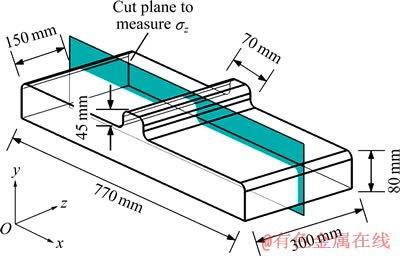 1) 切割试样。采用电火花线切割技术将试样沿需要研究和评估的截面切割。轮廓法假设切割面的变形完全由残余应力的释放导致,未产生任何塑性变形。试样两端紧固定于工作台上,以防止任何切割过程中的刚体位移。试样从尺寸为5570 mm×770 mm×125 mm的毛坯端部取得长度为300 mm一段。设备采用苏州金马DK1203型数控线切割机床,电极丝为直径为0.01 mm的钼丝。试样尺寸和切割面位置如图2所示。