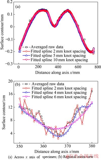 由于三次样条曲线具有二阶连续特征,轮廓法通常采用三次样条差值函数拟合切割面的变形轮廓。分布在区间内给定的差值点称为节点(Knot)。本文作者采用2、4和6 mm 3种节点步长的三次样条差值函数对轮廓进行曲面拟合。拟合曲面的质量定义为拟合度(S):