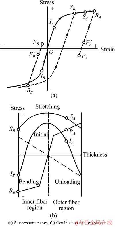 拉弯工艺是一种机械消除淬火残余应力的方法。先弯后拉,当毛料与模具完全贴紧后,由于模具对毛料的摩擦作用,后加的拉力很难均匀传递到毛料的所有剖面,因此也会影响后加拉力的效果,所以生产实践中往往采用先拉后弯最后补拉的复合方案。考虑简单的单轴应力情况,如图6所示。点IA与点IB代表初始的淬火残余应力。在拉伸过程中,原本为拉应力的点IA与压应力的点IB,沿着应力应变曲线移动,进入塑性阶段后同为拉应力点SA与SB。弯曲时,材料外层受拉,内层受压。SA点则因继续加载,由SA点上升到BA点。SB点则因反向加载,由SB点移动到BB点。卸载之后,BA与BB点沿应力应变曲线回弹至FA与FB点。回弹量决定了最终的应力符号。如图6所示,最终应力状态是拉伸、弯曲与卸载应力的叠加。拉弯成形残余应力不仅与弯曲半径和截面形状相关,而且受材料的各向异性和成形加载方式等影响,是一个高度非线性问题,很难精确预测拉弯变形后的残余应力分布。