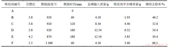 经燃烧反应后的吸收剂,按前面所述分析方法,测得吸收剂中的磷含量,并按式(1)计算出磷的去除率,所得结果见表2。