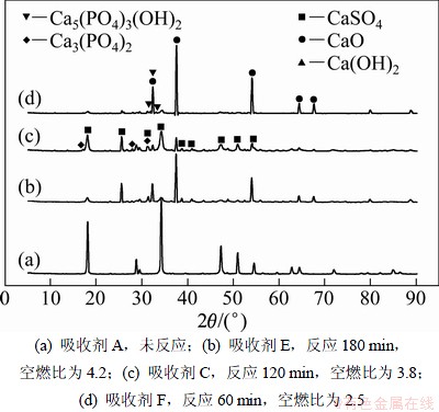 空燃比为3.8时,硫和磷同吸收剂反应生成CaSO4,Ca3(PO4)2和Ca(OH)2加入量为15.9 g;空燃比为2.5时CaSO4发生分解,磷同吸收剂反应生成物只考虑Ca3(PO4)2,Ca(OH)2加入量为5.02 g。