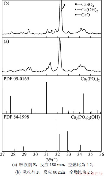 图6和图7所示分别为不同空燃比和不同反应时间条件下吸收剂的XRD谱及局部放大图。由表2可见:3种反应后的吸收剂磷含量接近。空燃比为4.2和3.8时反应生成Ca3(PO4)2,但对比图5(b)和图7(a)发现:吸收剂C中Ca3(PO4)2特征峰强度比吸收剂E的高,说明低温并不利于Ca3(PO4)2晶相的生成。在空燃比为2.5的XRD谱中除发现Ca3(PO4)2外,还发现了新生成物碱式磷酸钙(Ca5(PO4)3(OH),PDF:84-1998),同时CaSO4特征峰变的不明显。根据Ander等的研究发现[14]:氧含量很低时会导致CaSO4的分解,结合前面的分析可以断定空燃比为2.5时空气和燃气基本完全反应。