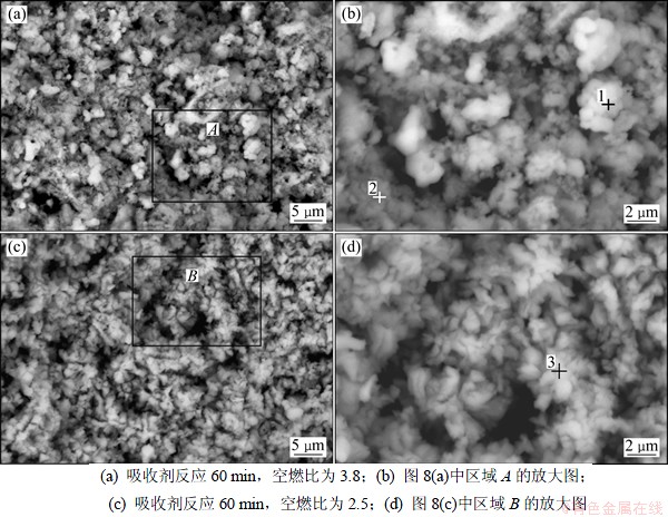图8所示是当反应时间为60 min,空燃比分别为3.8和2.5时的SEM背散射电子像。图8中1,2和3点EDS微区元素分析如表3所示。