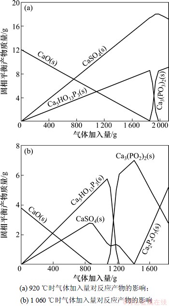 (3) 在压力101.3 kPa条件下,依据表2和表4,温度920 ℃时气体加入总量2 123 g(计算范围0~2 123 g,步长43),Ca(OH)2加入量15.9 g。温度1 060 ℃时气体加入总量1 835 g(计算范围0~1 835 g,步长37),Ca(OH)2加入量5.02 g。通过改变气体加入量对反应产物进行预测,结果如图9所示。