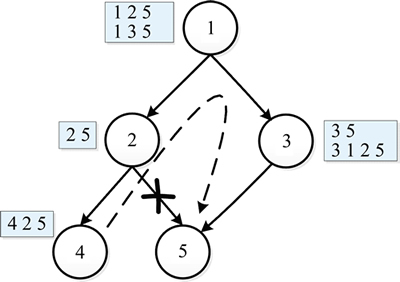 BGP路由收敛过程中的瞬态故障如图1所示,其中,节点5是目的节点。若链路(2 5)出现故障断开,则节点2会向它的其他邻居节点,即节点1与节点4发送路由撤销消息,撤销其已经失效的到达目的节点的最佳路由(2 5)。对于节点4而言,在收到来自节点2的路由撤销消息后其路由表为空,即它与目的节点之间失去连接,导致数据丢失。虽然在BGP路由收敛过程结束后,节点4的路由表中存在新的到达目的节点的最佳路由(4 2 1 3 5),但在收敛过程中,其无法与目的节点5保持持续的连通性。