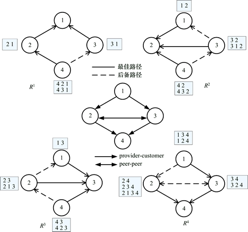恢复路由和保护路由实例如图2所示,图中共有4个AS节点,其中节点对<1 2>,<1 3>,<2 4>和<3 4>之间都是provider-customer的关系,<2 3>之间为peer-peer关系。