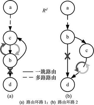 保护路由模型不会产生的路由环路现象如图3所示,其中,目的节点为d。当链路(b d)出现故障时,链路的直接上游节点b将会选择来自其邻居节点c的后备路由转发数据。假设节点b在选取后备路由转发数据时会产生路由环路,则只可能出现如下2种情况:一种路由环路是由于选取来自节点c的后备路由所产生的(图3(a));另一种路由环路出现在节点c到目的节点d的最佳路由上(图3(b))。