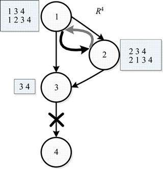 证明: 保护路由模型在AS节点的路由更新消息中引入根源信息。在BGP路由收敛过程中,如果某个AS节点收到其邻居发送的包含根源消息的路由撤销消息,则该节点不仅知道其邻居节点的最佳路由失效,还能识别出其他与这条失效链路相关的路由并将它们从路由表中删除。例如在图4中,如果节点3在路由撤销消息中包含根源消息(即链路(3 4)出现故障失效),那么当节点1和2收到来自3的撤销消息时,不仅知道路由(3 4)被撤销,而且还知道引起路由撤销的原因是链路(3 4)出现故障失效了,因此,节点1和2将会从各自的路由表中删除与链路(3 4)相关的所有路由,即除了删除它们原有到达目的节点4的最佳路由,还将分别删除路由(1 2 3 4)和(2 1 3 4),这样就可以避免图4所示的路由环路现象。