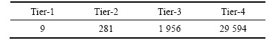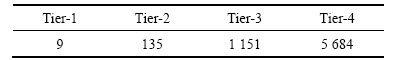 在商业关系的约束下,AS节点在网络拓扑中的层次一般都处在其所有的提供商(provider)的层次之下。本文根据每一个AS节点连接的客户(customer)数目对网络拓扑进行分层[14],每层AS节点的数目如表1所示。网络的第1层(Tier-1)由当前已知的9个AS节点组成,即AS174,AS209,AS701,AS1239,AS2914,AS3356,AS3549,AS3561和AS7018,这9个AS节点是顶层服务提供商,它们只为其他AS节点提供数据传输和转发服务,而不作为其他AS节点的客户;第2层(Tier-2)是由客户数目大于50的AS节点组成;第3层(Tier-3)AS节点的客户数目大于5但小于等于50;第4层(Tier-4)则是由客户数目小于等于5的AS节点组成。