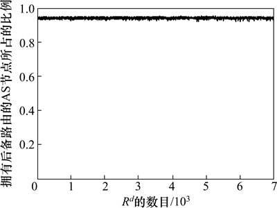 对于每个Rd,首先评估拥有后备路由资源的源AS节点所占的比例,其结果如图5所示。从图5可以看出:对于任一Rd,超过90%的源AS节点都拥有到达目的节点的后备路由,这一结果充分说明本文提出的保护路由模型在现有互联网上具有可行性。在BGP路由收敛过程中,可以利用这些已经存在的后备路由资源实现保护路由(无需计算和传输额外路由),确保AS节点之间无中断的数据传输。