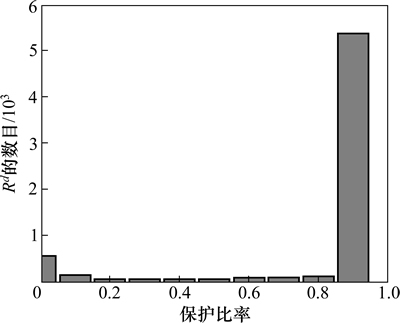 是否受保护(即源节点s是否受保护);然后计算Rd的受保护比率;最后评估整个域间网络的可保护程度。其结果如图6所示。从图6可以看出:绝大部分的Rd (大于5 200个Rd)拥有较高的受保护比率(保护比率大于0.85),即在不增加BGP路由器额外开销的基础上,仅利用当前AS节点路由表中已经存在的后备路由资源,就可以确保在BGP路由收敛过程中Rd中85%以上的源AS节点实现保护路由,即无中断的数据传输。