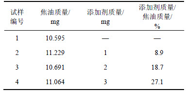 试样的可燃特性指数和稳燃特性指数见表3。由表3可知:少量添加剂能提高气化松焦油的可燃特性与稳燃特性,但加入量不能过大;当添加剂达到2 mg时,可燃特性与稳燃特性迅速下降;当添加剂质量达到3 mg时,可燃特性与稳燃特性已经差于没有加入添加剂的情况。