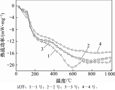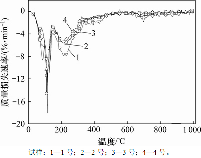 图1、图2和图3分别为各试样的热重、微分热重和差示扫描量热曲线。
