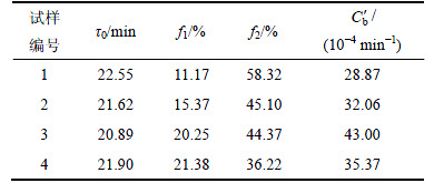 式中:f1为初始燃尽率,反映焦油中易挥发轻质烃的质量分数,体现了焦油的着火特性的影响;f2为后期燃尽率,反映了焦油重质烃成分的燃尽性能,与重质烃中碳的含量及其赋存的形态等有关;τ0为焦油燃烧质量损失开始到质量损失率为98%的时间。
