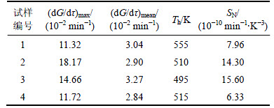 式中:(dG/dτ)max为最大质量损失率;Tmax为最大质量损失率下对应的温度。Cb主要表征试样燃烧前期的反应能力,该值越大则可燃性越好。G越大,则试样的燃烧稳定性越好。