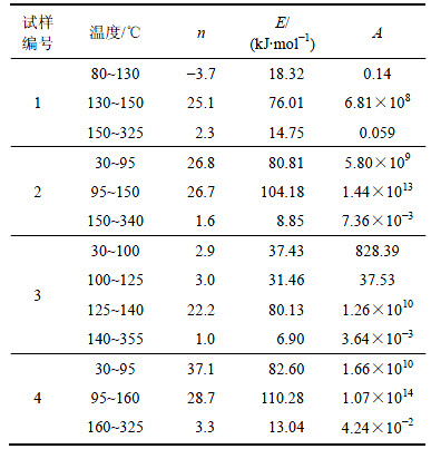 在各试样的热质量损失率峰处拟合得到各温度区间的不同反应级数的燃烧动力学特性参数及燃烧反应级数的相关性曲线图,取最高线性相关,计算得到如表6所示动力学参数。
