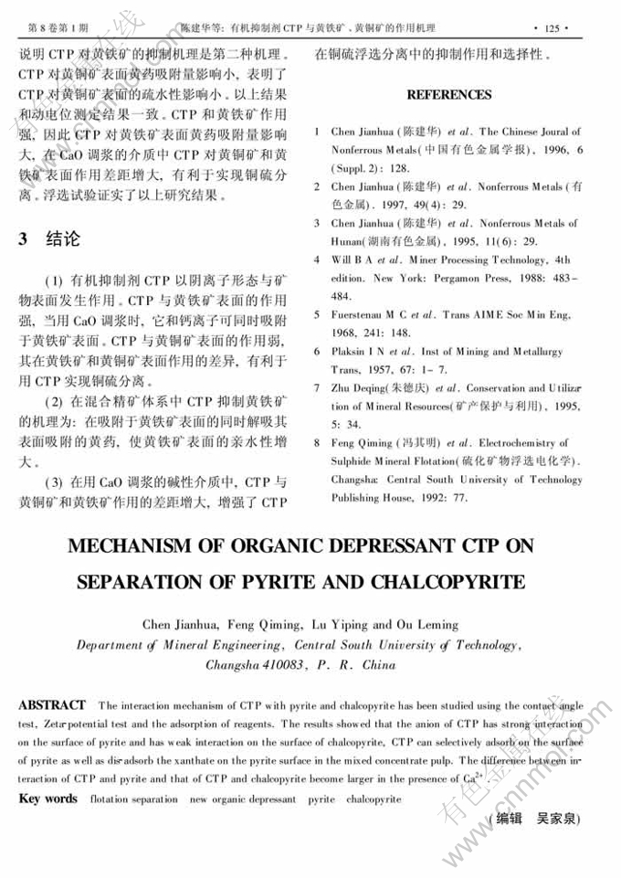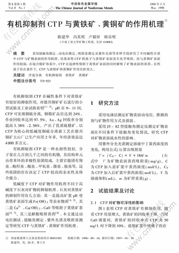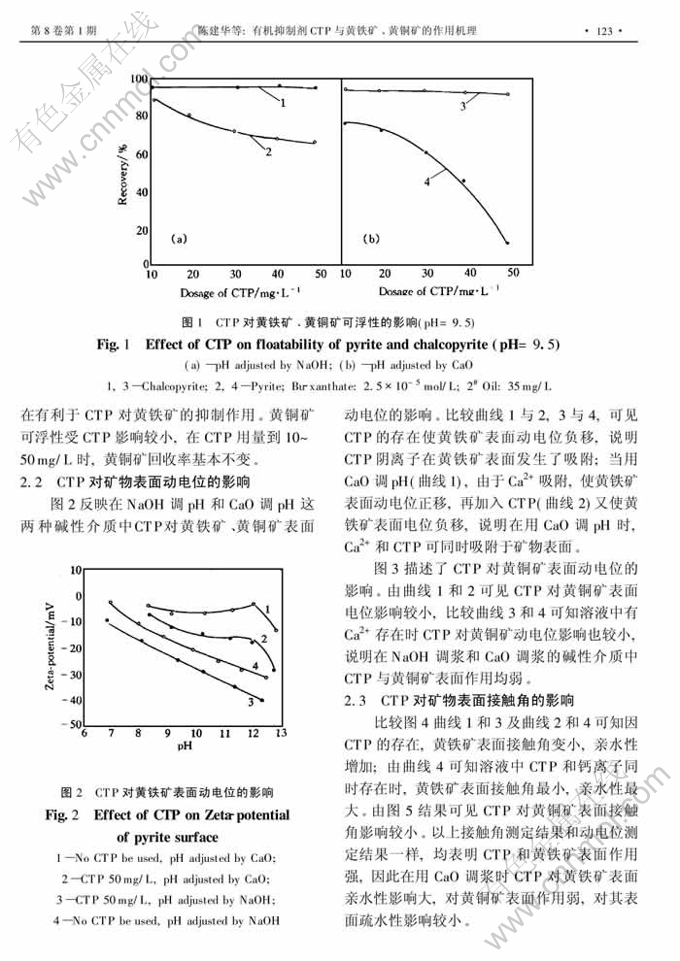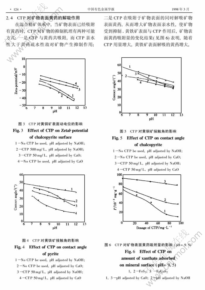 摘 要:采用接触角测定、 动电位测定、 吸附量测定及紫外光谱等多种手段研究了不同碱性介质中CTP与矿物表面的作用机理。结果表明CTP阴离子与黄铁矿表面发生化学吸附,而与黄铜矿表面作用较弱;在混合精矿体系中,CTP在选择性吸附于黄铁矿表面的同时解吸了矿物表面的黄药。 在钙离子存在条件下,CTP与黄铁矿和黄铜矿作用差距变大。