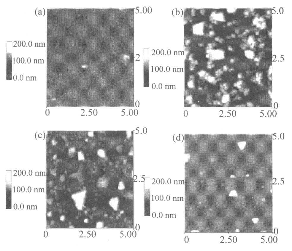 图1给出的是蓝宝石表面形貌的AFM照片, 扫描的区域为5×5 μm, 这一组图反映了随氮化时间的延长蓝宝石衬底表面形貌的变化情况。 在氮化初期, 首先是AlN晶核在衬底表面形成, 接着岛状AlN在晶核附近长大。 从图1 (a) 中, 可看出氮化1 min时衬底表面只有少量的分布稀疏的岛状AlN晶粒。 由图1 (b) , 随着氮化的进一步进行, 岛状AlN晶粒的密度和尺寸均增大。 然后相邻AlN岛合并, 岛的尺寸变大, 密度减小, 慢慢形成一层AlN薄膜, 并随氮化的继续, AlN膜表面越来越平整, 如图1 (c) 和 (d) 。