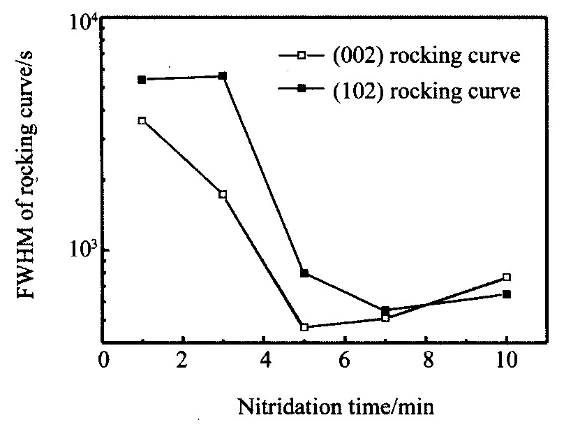 Fig.2 FWHM of rocking curve of the GaN layer as a function of substrate nitridation duration