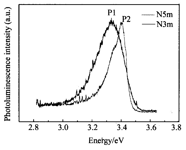 图3 不同氮化时间的GaN层的室温光荧光谱 P1: 氮化3 min; P2: 氮化5 min