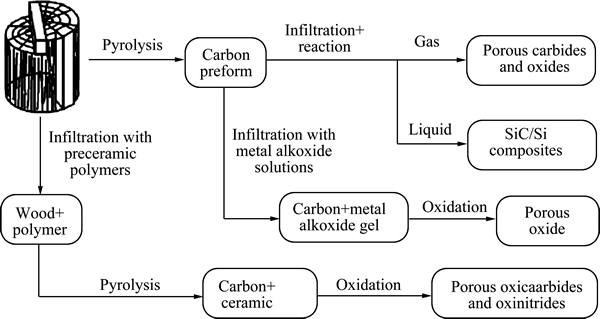 Fig. 4 Processing routes to transform wood structures into porous ceramics[32, 37]