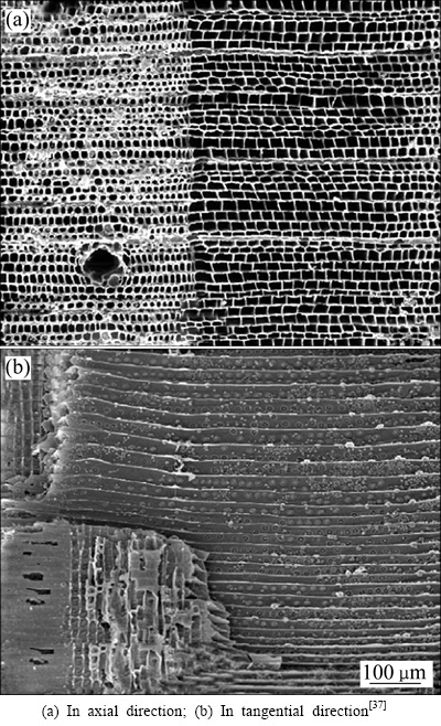 VOGLI等[38]选用松木作为原料,将其置于惰性气体环境下加热,并以一定速率升温得到生物碳模板。在氩气氛围下,通过气态Si与生物碳模板的反应,得到多孔SiC陶瓷。这种单相多孔SiC陶瓷的孔率为71%,孔径为20 μm,其轴向与切向的微观结构如图5所示[37]。由于制备的多孔SiC保留了木材原有的显著各向异性结构,其沿孔隙方向的力学性能要远高于垂直孔隙方向的力学性能。钱军民等[39]采用椴木木粉作为原料,浸渗酚醛树脂后压制成型并干燥、加热碳化,再将制得的碳模板包埋于Si粉中渗Si,随后真空加热除去未反应的Si。这种方式避免了使用块状天然木材作为原料时制备的碳模板可能存在的不均匀现象,同时少量的Si残余可以完善SiC骨架,提高陶瓷成品强度。