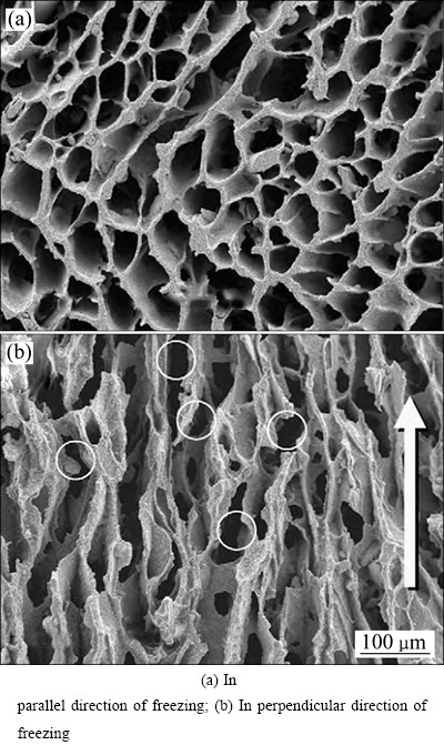 李红伟等[16]采用淀粉和石墨作为造孔剂,发现随着造孔剂添加量的增加,烧结后的多孔陶瓷成品的孔率也呈上升趋势。当造孔剂添加量增加到一定程度后,造孔剂烧损率上升,陶瓷成品的孔率上升趋势变得不明显。FUKUSHIMA等[17]采用冷冻-干燥法制备多孔SiC陶瓷,避免造孔剂分解产生气体破坏孔隙结构。其过程如下:首先将SiC粉末和添加剂加入明胶溶液并混合均匀,再注入模具并置于低温乙醇中使胶体凝固结晶,最后使用真空冷冻干燥机使结晶的胶体升华。采用这种冷冻-干燥工艺制备的多孔SiC陶瓷具有较高的孔率,同时通过控制结晶方向可获得具有各向异性孔隙的多孔SiC陶瓷,其显微结构如图6所示[17]。