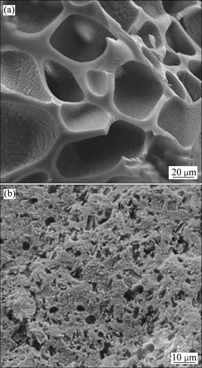 Fig. 7 Typical fracture surfaces of foamed preceramics(a) and sintered specimen(b)[21]