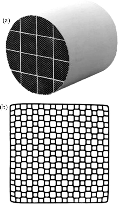 Fig. 9 General view(a) of DPF and sectional morphology(b) of SiC bar showing channels topology[48]