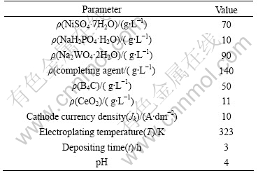 [26] ZHU Cheng-yi, YAO Hua-xin, NI Hong-wei. Effect of concentration of sodium tungsten in electroplating bath on properties of nickel-tungsten-phosphorus ternary alloy[J]. Electroplating and Finishing, 2003, 22(2): 1-3. (in Chinese)