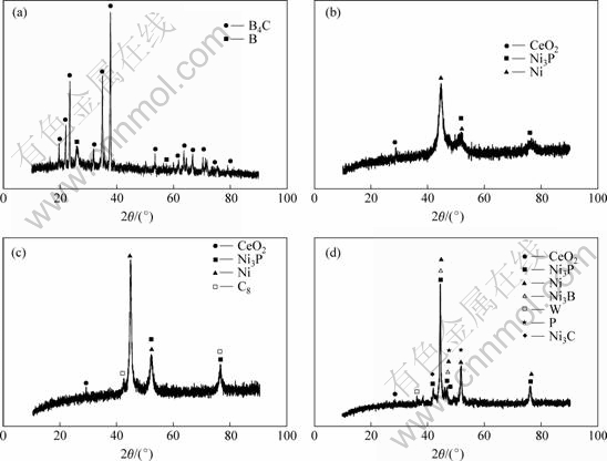 X-ray diffraction pattern of B4C powder in Fig.2(a) shows there is a little B crystal besides B4C crystal. In Fig.2 (b), the diffraction peaks of Ni, Ni3P and CeO2 appear and it is clear that there is a “bread” peak at 2θ =
