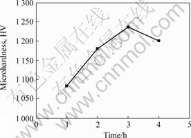 Fig.4 Influence of heat treatment time on hardness of composite coatings at 673 K