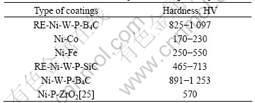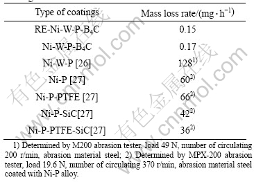 1) RE-Ni-W-P-B4C composite coatings were with suitable quantity particle were prepared. The coatings have good wear resistance and oxidation resistance properties.