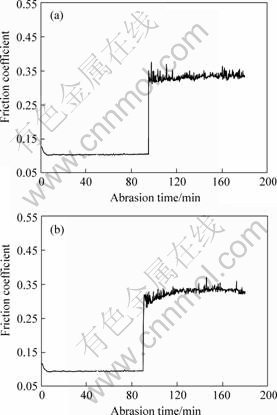 Fig.5 Relationship of friction coefficient and time of composite coatings: (a) Ni-W-P-B4C; (b) RE-Ni-W-P-B4C