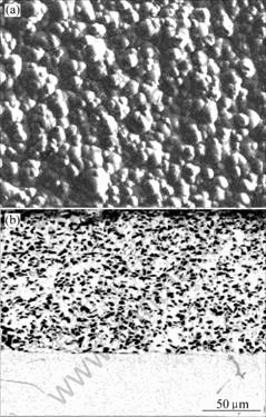 Fig.6 SEM images of RE-Ni-W-P-B4C composite coatings: (a) Surface morphology; (b) Section morphology