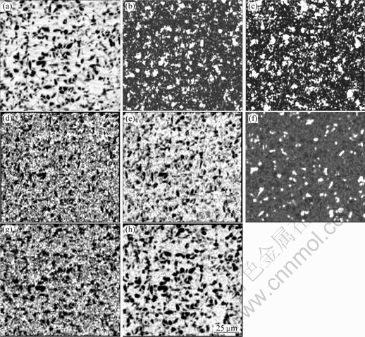 Fig.7 Surface morphologies of and surface scanning elements for RE-Ni-W-P-B4C composite coatings: (a) SE image; (b) BK image; (c) C; (d) W; (e) P; (f) Ce; (g) Fe; (h) Ni