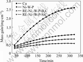 6) The increased mass of oxidized film of Cu matrix, Ni-W-P, RE-Ni-W-P-SiC and RE-Ni-W-P-B4C coatings is approximately a linear function of the oxidation time when oxidation time is less than 60 min, while the former is a power function of the latter when the heat treatment time is over 60 min. The oxidation rate order of the four coatings from high to low is Cu matrix, Ni-W-P, RE-Ni-W-P-B4C, RE-Ni-W-P-SiC.