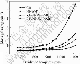 The high temperature-oxidation resistance of RE-Ni-W-P-B4C composite coatings as well as the matrix copper, Ni-W-P alloy coatings and RE-Ni-W-P-SiC composite coatings was determined by means of mass gain method, the specimen mass changing with the treatment time was recorded by electronic thermal balance. A vertical type of electric resistant furnace with a quartz reaction tube was employed. The oxidation experiments were carried out at the temperatures from 673 K to 1 113 K. The temperature was measured and controlled by two S type thermocouples, respectively. The experimental temperature accuracy was controlled within ±2 K by a PID controller. The oxidation rate was the mass gain per unit area of the samples (mg/cm2).