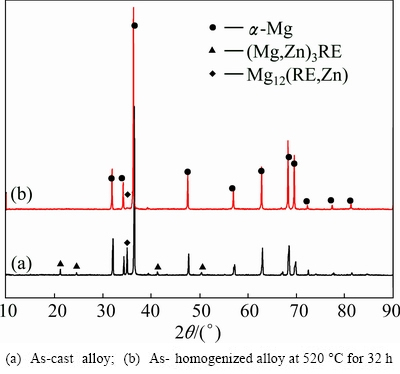 1) The microstructure of as-cast alloy consists of α-Mg, (Mg, Zn)3RE phase and stacking fault. The microstructures are characterized by α-Mg matrix and 14H-type LPSO phase after homogenization at 520 °C for 32 h.