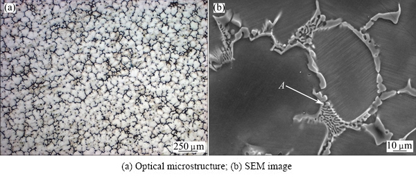The XRD pattern of the as-cast alloy is shown in Fig. 1. It can be seen that all the peaks are indexed as arising from two phases, i.e., α-Mg and (Mg,Zn)3RE eutectic phase. The microstructure of the as-cast alloy is mainly composed of α-Mg matrix and amounts of eutectics which mainly aggregate at the grain boundaries, especially at tripe junction of grain boundaries, and the average grain size is about 169 μm (Fig. 2(a)). The eutectic phases are present in skeleton-shape and the needle-like structures uniformly distribute near grain boundaries. EDS results in SEM analysis are shown Table 1. The typical average chemical composition of the skeleton-shape eutectic phases (point A in Fig. 2(b)) is Mg-10.08Gd-4.54Y-2.81Nd-6.45Zn (mole fraction, %).