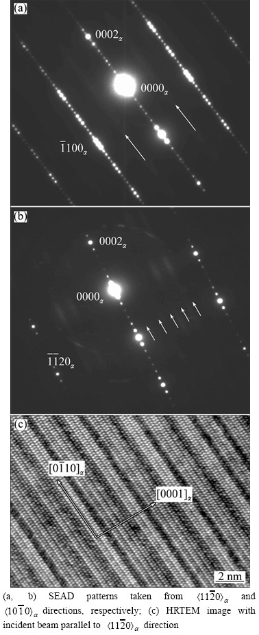 zone diffraction pattern in [0001]α reciprocal lattice row (c* axis) at positions determined by dividing the distance between the transmitted beam and the (0002)α fundamental reflection by 14 (Fig. 7(a)). Five sets of weak streaks occur along the g(0001) direction and throughthe