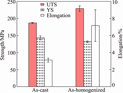Figure 8 shows the mechanical properties of the alloys. The UTS, YS and elongation of as-cast alloy are 187 MPa, 143 MPa and 3.1%, respectively; while the UTS, YS and elongation of as-homogenized alloy are 229 MPa, 132 MPa and 7.2%, respectively.