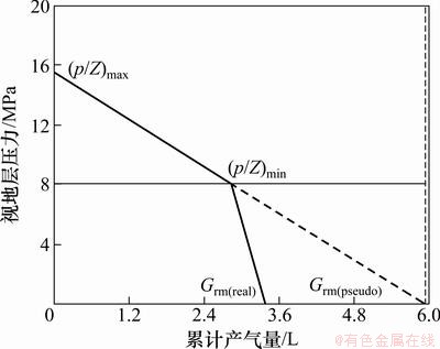 目前,矿场普遍采用气库运行阶段的压降曲线外推计算气库的可动库容,而对于水驱气藏,如果用高压段的压降曲线外推可动库容会造成较大误差,应利用低压段外推回归计算确定气库的真实可动库容。为计算水驱气藏型储气库的真实可动库容,假设一虚拟定容封闭型储气库,高压段压降曲线与水驱气藏型储气库完全一致,即视地层压力下降幅度相同,累计产气量相等,根据两者对应关系修正计算水驱气藏型储气库真实可动库容。首先,由虚拟定容型气库压降曲线外推得到虚拟可动库容Grm(pseudo):