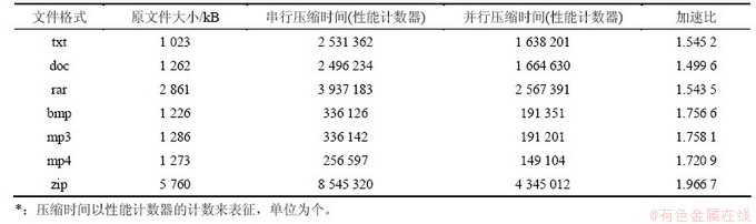 从表2可知:对不同类型文件进行压缩时,其加速比都在1~2之间,有的甚至接近2(处理器核数目)。可见,并行程序大大提高了多核处理器的利用效率,并行模拟大幅度提高了多核处理器的利用率。从表2可以看出加速比和原文件的大小存在一定联系。
