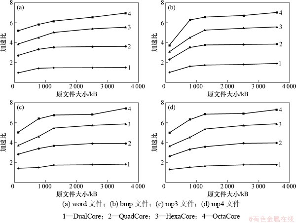 图4所示为分别采用双核处理器、四核处理器、六核处理器、八核处理器测试压缩不同大小的同类型文件,选取的文件类型为doc格式、bmp格式、mp3格式、mp4格式,其文件加速比与压缩文件大小的关系。从图4可知:对于不同类型不同大小的文件,其用双核处理器、四核处理器、六核处理器及八核处理器进行并行压缩,加速比都达到1.5~8.0,有些甚至非常接近处理器核的数目。这表明基于 OpenMP 的压缩解压程序的算法并行性得到了极大提高。
