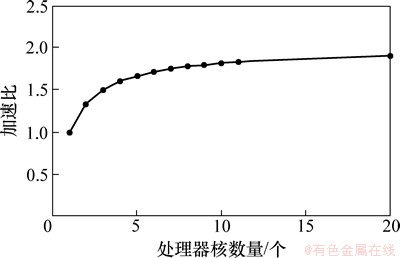 但在实际情况中,开发更大的并行性所得到的性能效益可能很小,即在并行程度不高或者既定的情况下,随着计算机处理器核数量的增大,应用程序的效率并不一定能显著提高。图5所示为并行率确定为0.5时,增加处理器核数目对加速比的影响。由图5可知:当并行率为0.5时,根据Amdahl定律即式(4),增加处理器核数量时,加速比最大值为2。不论如何增加处理量数目,加速比均不会超过这个极值,可见提高程序的并行化比例具有重要意义。